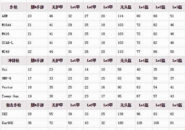 按照不同的部位,不同的武器,不同的防具来计算伤害的,这种按道理来说要分开的。伤害表可以自己计算,这个伤害都是测试过的,我们自己减少对应的比例就知道了。伤害都是固定的,打伤害就要打头,武器就要用AWM,伤害高的直接一枪爆头。