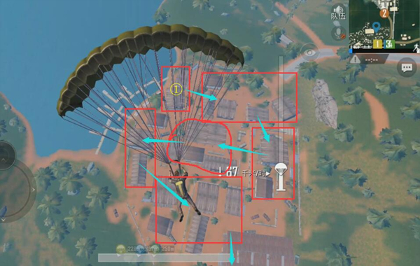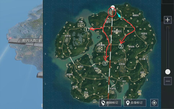 如果安全区朝中心或东或南刷, 那么我们就可以直接选择②号线,注意线路,要尽可能规避天堂度假村这个热点。这个时候很多提前跑出来的或是已经搜完该区域的玩家,遇到了就免不了要打劫,所以尽可能规避。